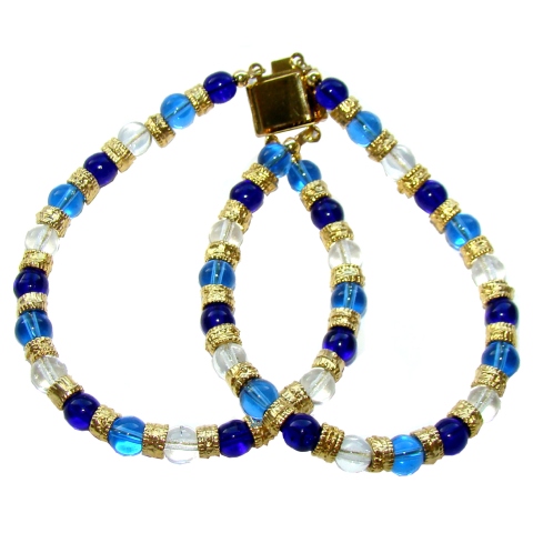bleu marine, bleu et les perles de verre transparentes sont nouées sur double fil, et le fermoir de sécurité est en métal doré, très joli et solide.