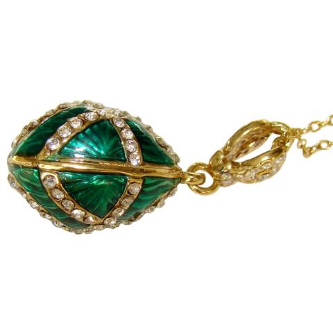 Ce Pendentif oeuf fabriqué en alliage doré recouvert d'émail vert, décoré par les strass